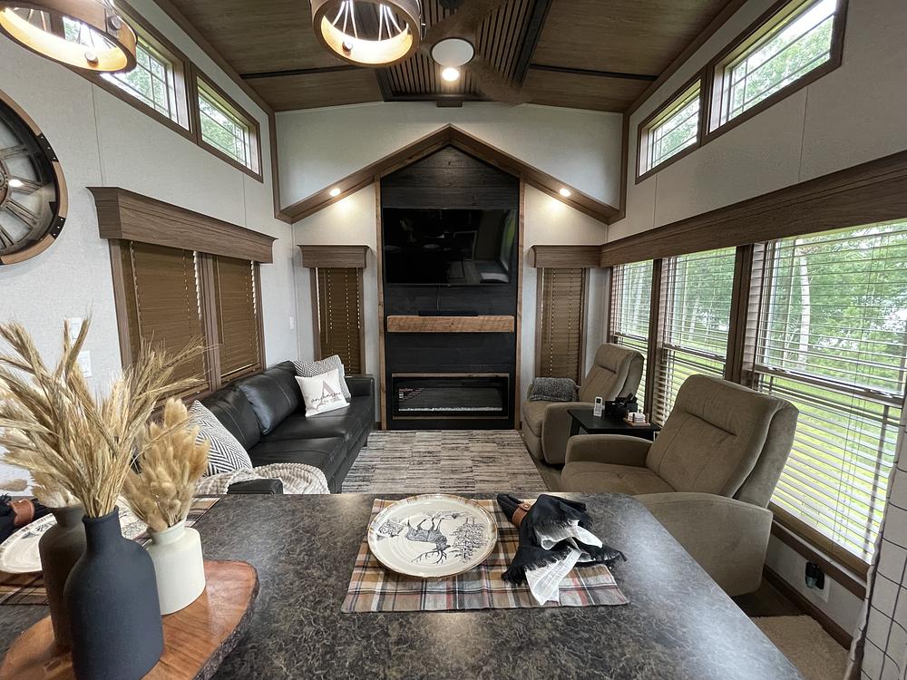 Features: Upgrade Metal Roof, Upgrade siding + shake siding, Upgrade clay windows with perimeter grids, Upgrade ceiling with Upgrade beam, Upgrade 48" fireplace focal wall and 55" TV, Upgrade wood valances, Upgrade insulation package, Upgrade 2 Head Mini split ac/heat system, Mini frig, dishwasher, Washer/dryer prep, Upgrade leather sofa, 2 recliners, Upgrade ceiling fan box, Upgrade ceiling fans in LR & bedroom, Upgrade apron sink, Upgrade slate appliances, Upgrade bathroom lighted mirror, Upgrade shower, Upgrade focal walls, King Bedroom with vaulted ceiling, and more....