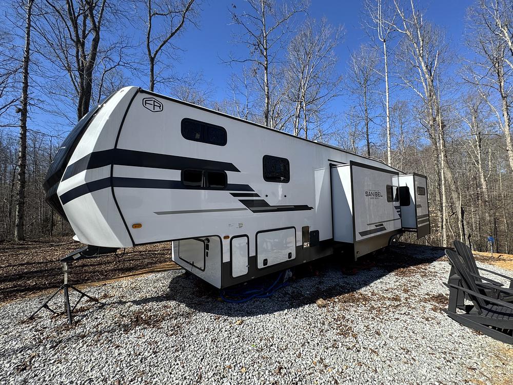 This beautiful Prime Time Sanibel fifth wheel is only 9 months old and has extremely low miles, making it a rare opportunity to own a nearly new luxury RV without the new-unit price tag.