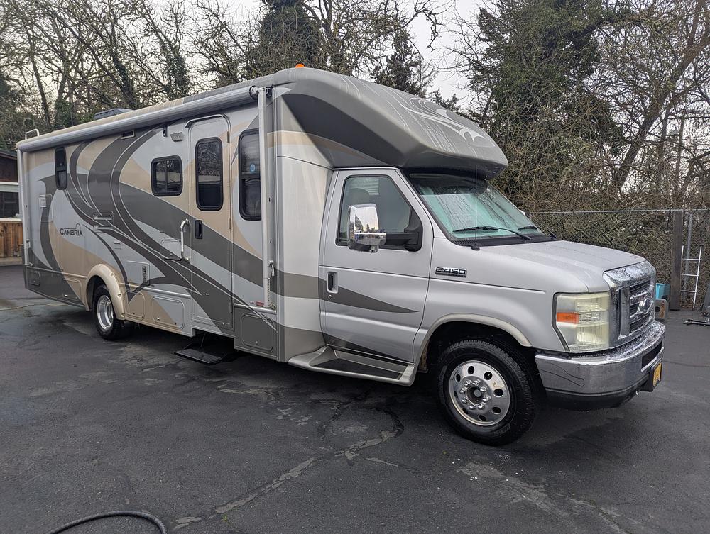 This is a double slide Class C motorhome that has a Ford V10 engine and 27,700 miles. It has a large u-shaped dinette in the living room/kitchen area that doubles as a bed, as well as another chair for relaxing and talking. The kitchen is equipped with a double sink, range, microwave, fridge, and pantry/storage space. The bathroom has a toilet, and tub/shower combo with the sink and vanity in the bedroom area. The unit has a bed slide with a queen size bed, and a wardrobe for closet space. The unit comes with air, awning, generator, leveling jacks, and full body paint. Come see it at Jim Clark's Consignment Country 1630 Rogue River Hwy. Grants Pass, OR 541-476-0818 or 800-675-0818 Closed Sundays Dealer#2885 Our website @ www.clarksconsignment.com