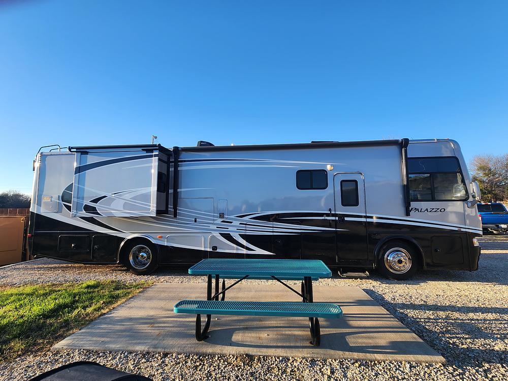 Thor Palazzo 36.1 with a 300hp 6.7 Cummins diesel with a Allison transmission on a Freightliner XC-s chassis with 45k miles, recently serviced at Herbert Truck Center in Gainesville, GA. 6k Onan Diesel generator, 2 slides, GVWR 28k GCWR 33k, Blue ox hitch included, pulls a Jeep Wrangler like a dream. This coach has all New Leather front seats, 3 person reclining sofa and table with chairs. 3 new Roku smart TV's. Splendid vented stacked washer and dryer, that works great. This 36.1 comes with a ton of storage and bath & a half. Awning in great shape. This Rv has been driven across the US 2xs in 2025.