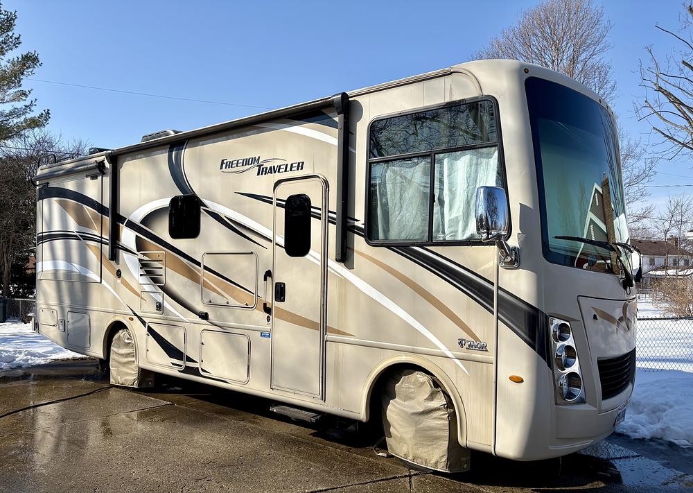Clean, one owner motorhome. Small enough to be easy to drive, yet spacious inside. Two slides, living room and bedroom. Auto levelers. Ford V-10 chassis, runs great. Regularly serviced. Queen bed in private bedroom, drop down full size bed over cab, jack knife sleeper sofa and dining table coverts to bed. TVs in living room, bedroom, and outdoor under awning. Will include all electrical cords, fresh water hoses, sewer hoses and support stand for sewer hoses. Backup cameras. Outdoor shower. Cummins generator.