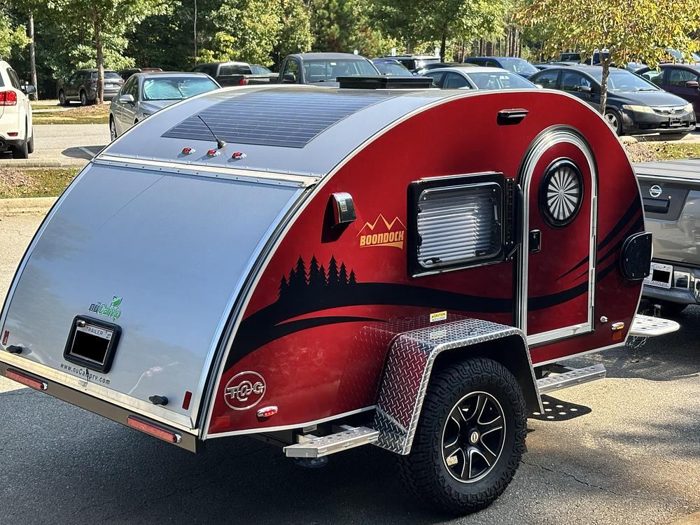 Rugged, 13'7" teardrop camper designed for off-grid travel, featuring all-terrain tires, increased ground clearance, and a specialized off-road package and weighs approximately 1,3401,505 lbs.