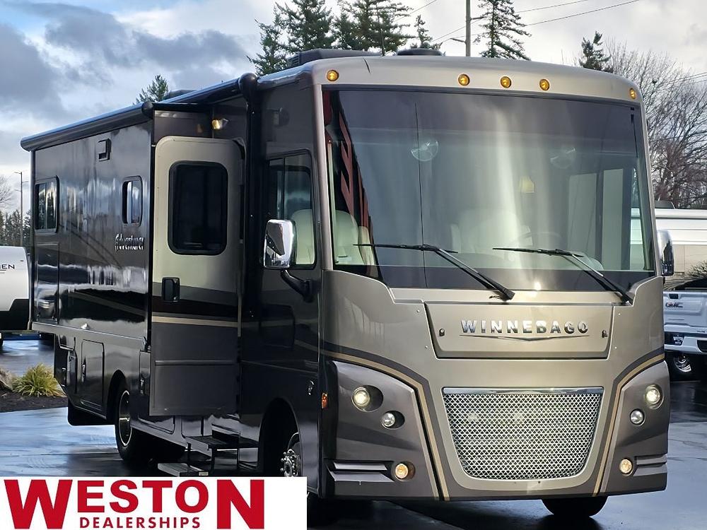 The Adventurer is Winnebago’s top‑tier Class A gas model—loaded with upscale amenities such as full‑body paint, Corian countertops, MCD solar/blackout shades, Primera upholstery, and a Versa swivel driver's seat. At just under 29 feet long, the 27N packs tremendous livability, storage, and premium features into a perfectly sized coach that can go almost anywhere.