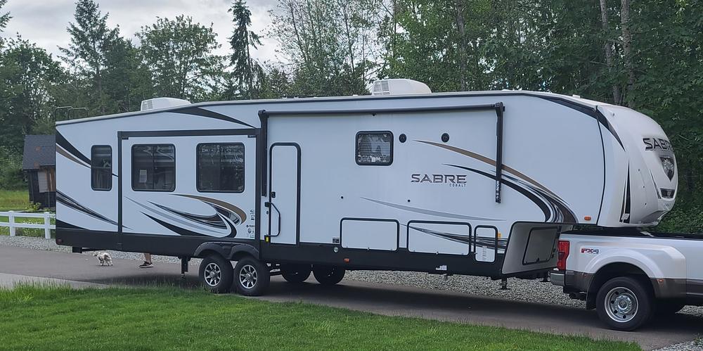 Super clean, fully loaded plus, very in demand open floor plan that you will rarely see. When not traveling it has always been kept fully garaged and plugged in. Just under 43 feet, with one touch auto leveling and built for all seasons. Back end kitchen with pantry, tons of storage space, propane range with oven, overhead microwave, and full size residential fridge that keeps ice cream frozen! One and half bathes, large flat screen TV with surround sound system (zoned for inside and outside), Fireplace, heated/lighted/massage loveseat, 2 full size pull out couches to beds, and zebra shades throughout. King size bed with a brand new mattress. Huge on suite bathroom with double sinks, super large 3 section storage vanity, larger shower with seat, hook ups for washer and dryer, and tons of storage space. Pop out slide awnings on each slide out (total of 3) along with larger awning over door, 2 air conditioners (15K BTU each), forced propane heat ducting throughout, with accent lighting and computerized control panel. 1 fresh gallon tank, 2 gray water tanks (one off kitchen and one off bathroom) 2 black water tanks (one for each bathroom). External outdoor prep area with sink and small fridge. Will include a water softener, water filter, basic septic and water hose. Juice pack Solar Panel package installed which runs the fridge during travel as well as charging. 2 propane tanks included. Ladder connected for roof access and future maintenance. All booklets and manuals included. Can deliver depending on location.
