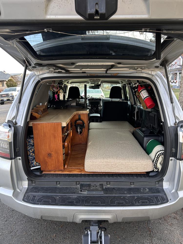 Custom 2022 Toyota 4Runner with camper mod, extended warranty. Beautiful customization with Cali Raised roof rack, back ladder and rear window rack. EcoFlow solar panel, alternator charger and Delta Two Max battery, Overland Vehicle Systems storage boxes. Wood design interior sleeping platform, shelves, cubbies - custom mattress. Swing away laptop holder, Weathertech mats, interior lights, Euhomy fridge. Perfect for cross-country treks, local camping or overlanding. Comes with OEM components (rear seats and belts). Comes with bumper-to-bumper warranty good another 20K miles.
