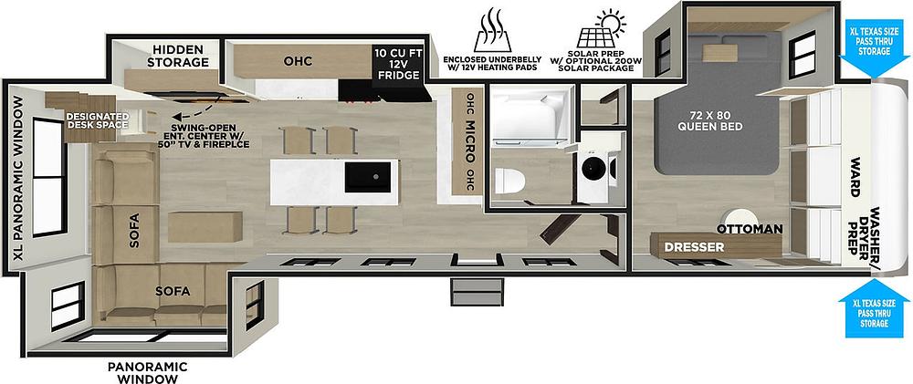 The rear living space, framed by panoramic windows, offers incredible views and abundant natural light. An inviting L-shaped sofa with ottoman sits directly across from the 50" TV and fireplace — perfect for cozy movie nights. Behind the TV, you’ll find hidden storage for added convenience, along with a dedicated desk space in the rear so you can easily work remotely while traveling.
