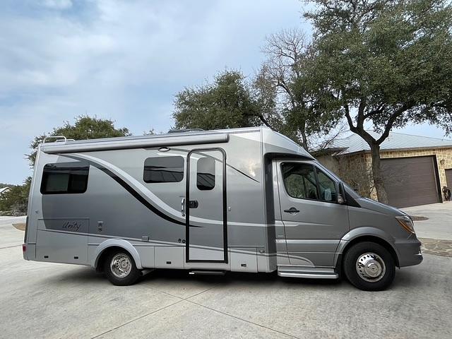 Outside, the Unity U 24 CB boasts a sleek and aerodynamic profile, making it easy to maneuver on the road. The exterior features storage compartments for all your gear, as well as an awning for outdoor lounging. With a powerful 3.0 Turbo V-6 Mercedes Diesel under the hood, this motorhome offers a smooth and reliable driving experience with efficient fuel mileage. The Unity is built on a Mercedes 3500 chassis. The unit features tankless water heater, 3.6KW Onan propane generator, new Michelin tires, new coach batteries, and new screw to axle attached wheel simulators. It also has auto stabilizer jacks.