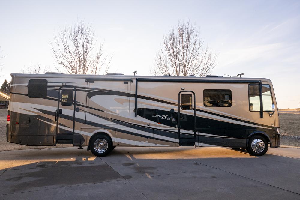 This 2015 Newmar Canyon Star 3921 toy hauler has had one owner and has been stored indoors. The well-maintained coach is in great condition. The captains chairs and jack-knife sofa were refinished with new foam and material in 2024 by Bauer RV Upholstery, which acquired the templates and several of the staff from Flexsteel when they exited the RV furniture business. This coach comfortably sleeps 8 people.