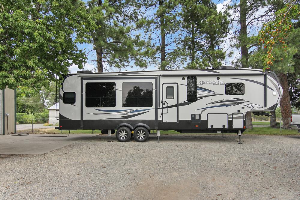 PRISTINE CONDITION: This 2016 Keystone Avalanche 355RK is a premium, three-slideout fifth wheel featuring a rear kitchen layout, designed for extended, four-season living. The rear kitchen layout is a seamless and expansive floor plan that offers an open concept living space with plush seating and a large entertainment center. It avoids the awkward breakup and narrow walkthrough of middle kitchen layouts commonly found in most RVs. In addition, you'll find luxurious amenities like solid surface countertops, a four door stainless steel refrigerater, a fireplace, a king-size bed, and a 6'8" interior height. Upgrades include, washer/dryer and a 4 quad solid step RV entry. The exterior is just as impressive as the interior. Aside from its key luxuries, this fifth wheel features a "distinctive" maximum durability coating that was professionally applied to prevent road damage. It was installed on the lower front face to keep it looking first-rate.