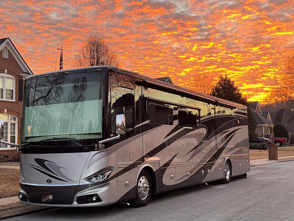 new Michelin tires w/12k mi (8/2023), new coach and chassis batteries (9/2023), Safe-T-Plus steering system (2/2024), Koni shocks (2/2024), new Schwintec slide system in bedroom(06/2024), new slide toppers (10/2023), new Girard power patio and entry door awnings, new ultra leather upholstery and foam rebuild to driver and passenger seats (3/2025) and annual roof coating maintenance.
