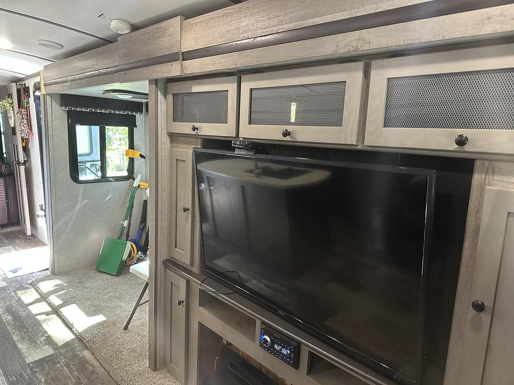 Maintained and Very clean, Never smoked in 3 slides, two ACs, auto levelers king bed, pull out couch, very comfortable. Fireplace, new theatre chairs, roll covers added above slide outs, new $1,000 lithium battery, storage rack on back, outdoor kitchen,
