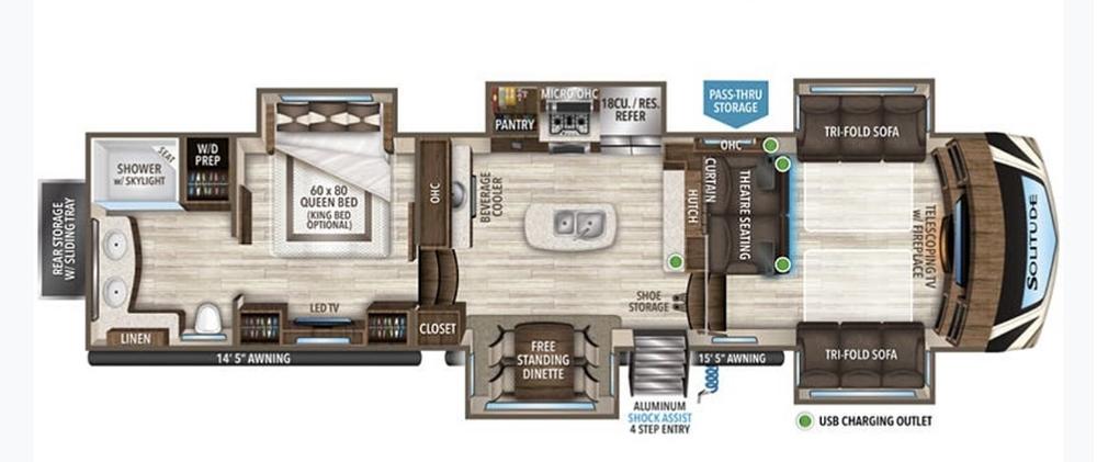The Solitude offers a modern and stylish interior with high-end finishes, including premium countertops, appliances, and furnishings. The open floor plan is ideal for entertaining guests or just relaxing after a long day on the road.