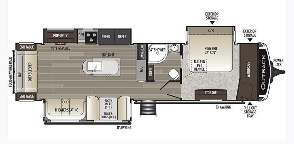 Outside, the Keystone Outback 328RL is just as impressive, with dual power awnings for outdoor living. Plenty of storage space for all your gear.