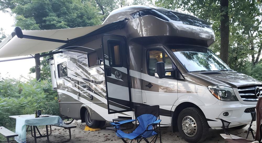 This 2017 Tiffin Wayfarer 24QW is a 25-foot luxury Class C motorhome built on a Mercedes-Benz Sprinter 3500 chassis. It features a rear slide-out that houses a queen bed and a front slide-out for the living area, allowing it to sleep up to four people.
