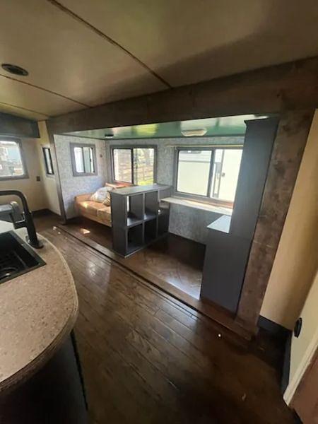 For outdoor comfort, it comes with two power-retractable awnings spanning 23 feet in total. The trailer also includes manual leveling jacks and aluminum wheels for stability and durability.