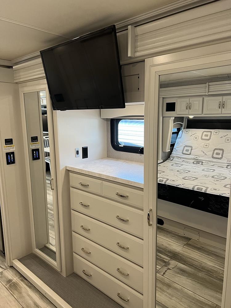 The interior of the Endeavor is beautifully crafted, with premium materials and finishes throughout. The living area features a large sofa and a dinette where you can relax and enjoy a meal or watch a movie on the flat-screen TV. The kitchen is fully equipped with a refrigerator, stove, microwave, and plenty of storage space for all of your cooking essentials.
