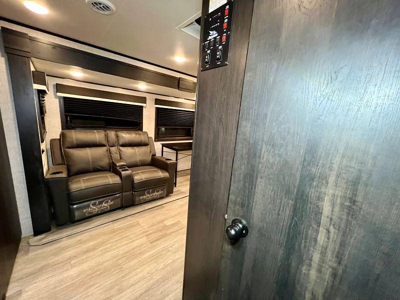 For outdoor enjoyment, the 25RB includes an exterior kitchen with a grill and refrigerator, an automatic awning, and exterior speakers. Additional features comprise an electric tongue jack, ducted air conditioning, a solar panel, and an outside shower. The trailer's holding tanks have capacities of 55 gallons for fresh water, 53 gallons for gray water, and 30.5 gallons for black water.
