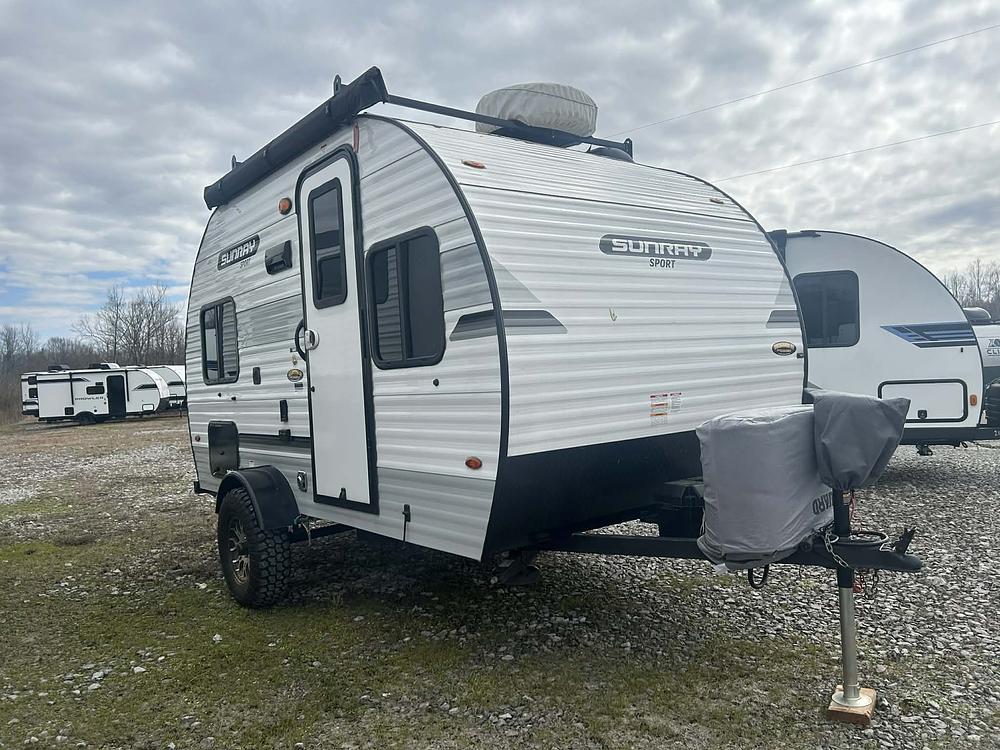 The 2023 Sunset Park SunRay Sport 149 is a compact, lightweight camper designed for easy towing and comfortable travel. It features a queen-size bed for the adults and a convertible dinette that provides additional sleeping space, allowing the camper to accommodate up to three people while weighing just 2,140 lbs.