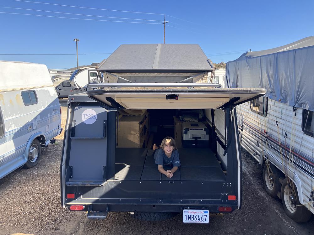 This Travel Trailer sleeps 3 adults and a child. Compatible portable solar panels included. Designed by Nasa engineer for stylish and comfortable interior space. Utilizes smart crate and bungee cord storage system. Great for kids and family travel.