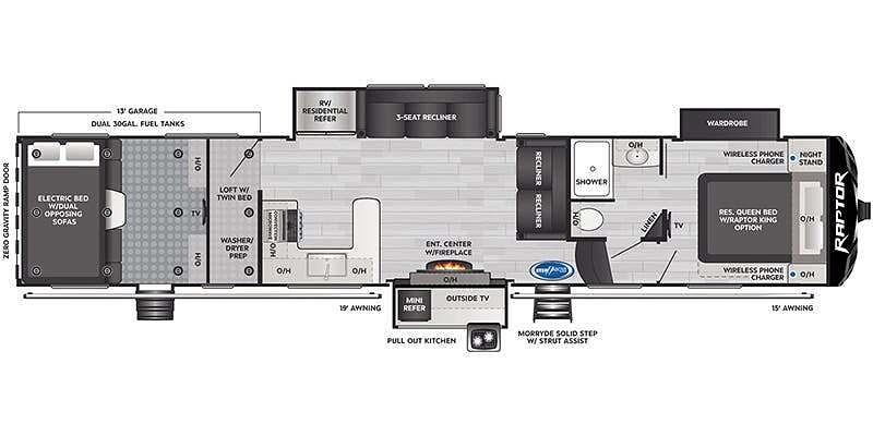 Inside the RAPTOR 423, you'll find a beautifully appointed living space that caters to both comfort and practicality. The interior design speaks to a sense of sophistication, featuring high-end materials, tasteful finishes, and an open layout that makes smart use of every inch. The spacious kitchen is fully equipped with state-of-the-art appliances, allowing you to prepare gourmet meals on the go. The living area offers plush seating, perfect for relaxing after a day of adventures, and a state-of-the-art entertainment system to keep you entertained. In the rear, the hauler section stands ready to accommodate your toys, whether it's ATVs, dirt bikes, or snowmobiles, ensuring you're ready for any kind of terrain.