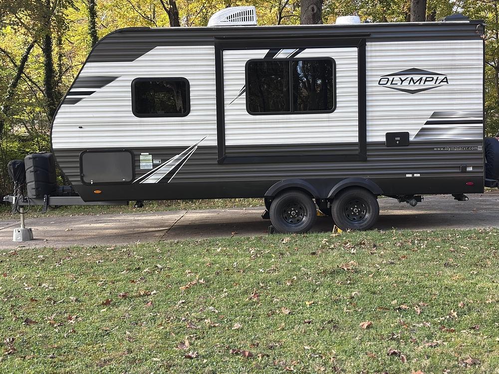 Just in time for camping season! Everything you need! Well-maintained, generously sized couples camper available for sale. 2022 Olympia 20FBS. Double axle. 23 feet long- 6000 lb. GVWR, dry weight 4385 lbs, hitch weigh 435. 48 gal. fresh water tank, 33 gal. black and 33 gal. gray. 2 30 lb. propane tanks.