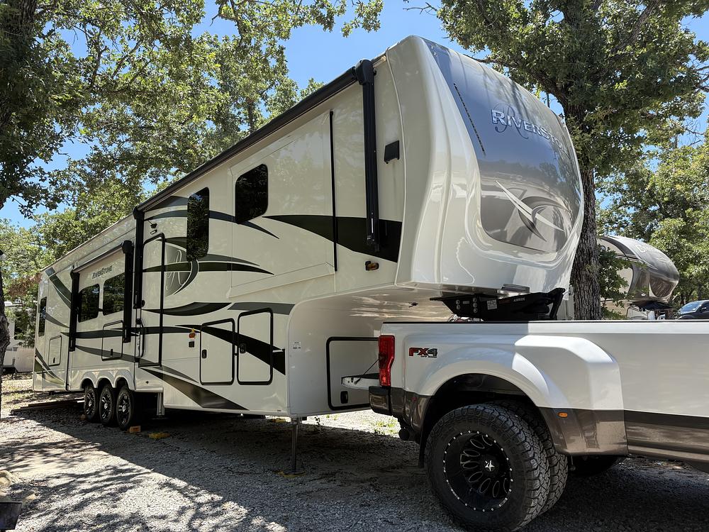 Experience true residential luxury on the road with this gorgeous 2023 RiverStone 442MC, one of Forest Rivers flagship high-end fifth wheels.