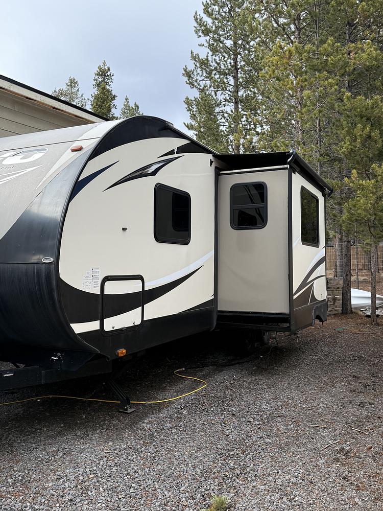 Priced to sell quick - 26 8 including tongue. solar installed . super nice floor plan with a u-shaped dinette in the tip out and a dividing wall separating the bedroom area with a nice queen bed - very comfortable mattress that has always been covered with a bed topper. 2 TVs - one on the bed side of the divider wall and one on the main side. Furnace and AC work great! Large fridge and freezer and microwave and oven - never really used microwave or oven. Large shower, upgraded porcelain toilet. Automatic jacks. Double axle, good condition!