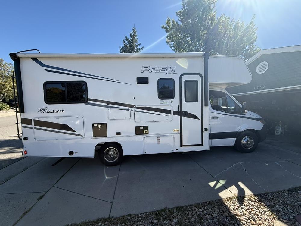 I have a 2023 Coachman Prism 2150CB. It is a 25-foot Class C with all the amenities. It features a Mercedes Diesel engine and a Mercedes Dashboard. The warranty is for 100,000 miles on the drive train. I added a software upgrade, so the vehicle is great in the mountains too. It has 66,000 miles on it. The RV has a slide in the living room area. The RV includes a propane stove, refrigerator, microwave, oven, a full-size bed in the rear, and an overhead cabin bed. Additionally, there is a dining table that transforms into a bed.It has Captain's chairs for both the passenger and driver seats. There is a solar panel to allow those who want to boondock. It has 1 TV. There's plenty of storage space in the RV. It drives like a dream. Recent maintenance of new brakes at 62k, new tires at 62k, transmission flush at 55k, and regular oil changes (8 since I bought it).