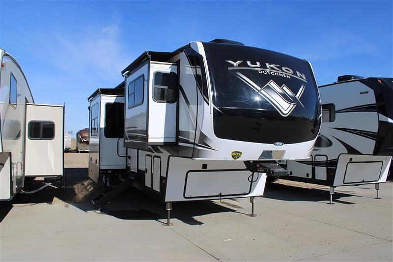 2024 Dutchmen Yukon 421FL with front living! 2 opposing trifold sofas which fold out for added sleeping, theater seating facing an entertainment center with TV and fire place. Mid kitchen area has an 18cf refrigerator, microwave, all in one residential oven with 4 burner cooktop, island with double basin sink, pantry and table and chairs. LOTS of cupboard space!! Full pass through bath with custom walk in shower, double basin vanity and separate toilet room. Large linen closet with washer/dryer. Master has a king bed in the slide facing an entertainment center with fire place and TV, and TONS of dresser and closet space! Secure stance steps, 3 ACs, 12V tank heaters with interior switches, automatic leveling system, slide out awning, solar package w/inverter, electric awning, and TONS of outside storage space with pull out tray! Very nice unit - stop by and check it out!!