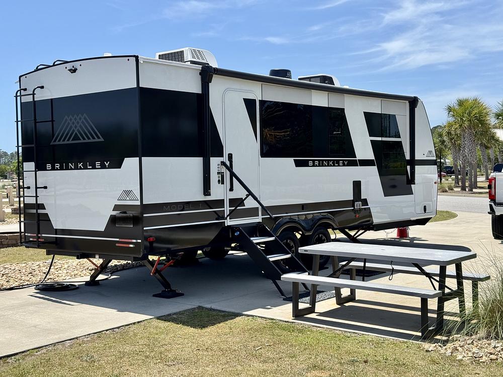 Its 29 11 in length with a GVWR of 9,600 lbs. Has Seamless Aluminum exterior walls with insulated floor and ceiling of R40. Square Euro frameless windows w/ Screens & Insulated Blackout Blinds. Anti-Lock Brakes w/ Anti Sway & Dynamic Brake Boost. 200 Watt Solar Panel w/ 30 AMP MPPT Controller & 3000 Watt Inverter. 2 ACs - 18K Chill Cube and 8K in Bedroom. On demand window Projection Screen that you can view indoor and outdoor with the Smart Projector. Living area has reclining chairs & large pull out dining table . Kitchen is well equipped w/ dishwasher prep. & large pantry. Cabinets are premium w/ dovetail joints in draws. Bedroom has RV King bed w/ lighted nightstands & deep walk in storage under the bed. Bathroom has a 42x30 one piece fiberglass shower & lots of storage. There is too much to list you can go to Brinkley.com or get in touch with me with questions.