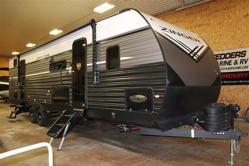 2026 Crossroads Zinger 328SB with rear bunk house! 5 Bunk beds in the back of the camper including 2 sets of bunks plus a fifth bunk over a jack knife sofa. Full bathroom with shower. Front private bedroom with a queen bed. U shaped dinette in the main living area which converts into a bed. 12V refrigerator, 3 burner stove, oven, microwave, and double basin sink. Main living area has a jack knife sofa, which turns into a bed, space for a TV, fire place and plenty of storage space throughout! 2 entry/exit doors from the main living and bathroom. Secure stance steps, outdoor dorm refrigerator and grill, 2 ACs, electric tongue jack, electric stabilizer jacks, portable exterior ladder, solar power prep, and back up camera prep. AWESOME camper and tons of sleeping space!! Stop by and check it out!