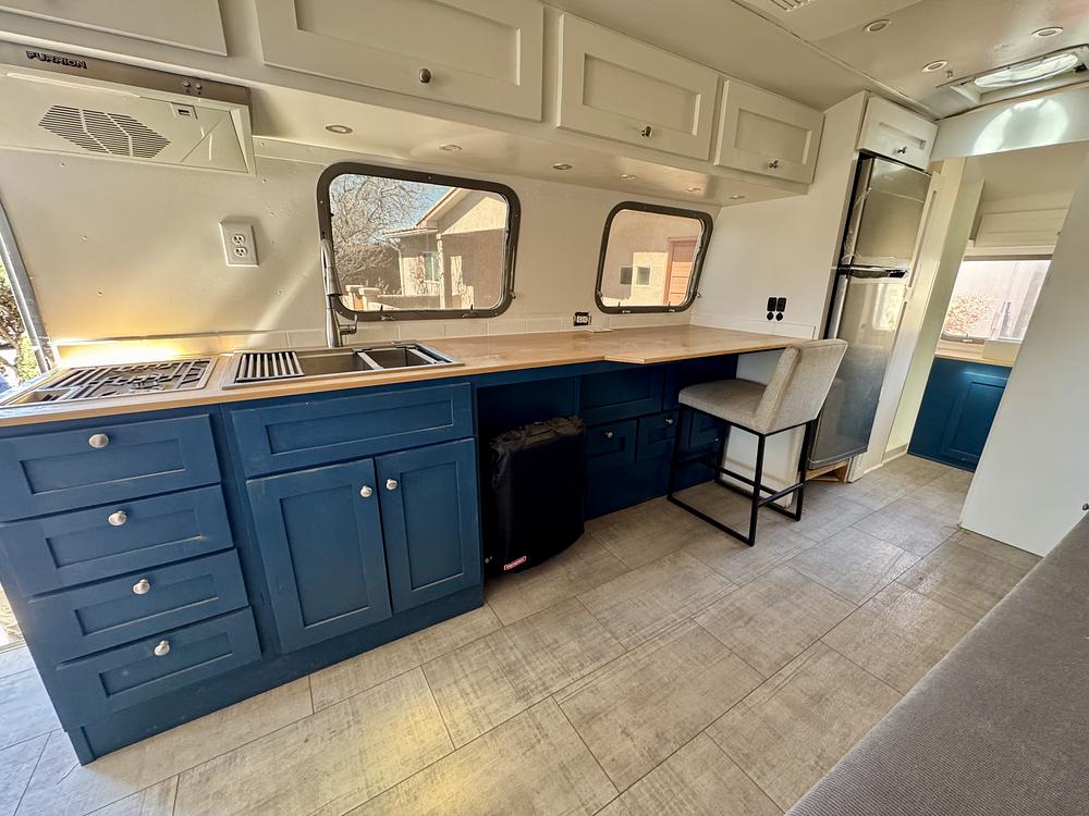 The kitchen features solid maple countertops complete with a bar area, a new kitchen sink, a new 12V refrigerator, a new gas stovetop and vent hood. The trailer also comes with a new converter and fuse panel, a 100-amp lithium battery, water monitoring systems, and a built-in inverter for 120V power off grid. Tons of extra storage with soft-close cabinet latches throughout ensures your belongings are secure on long road trips. The exterior upgrades include 2 new, 7-gallon aluminum propane tanks, new LED signal and marker lights, and a new LED over door light. Elastomeric roof coating. Sale will include 4 aluminum mag wheels from a late 70s Airstream, however the tires will need to be replaced. There are only a few small items that need to be completed, but otherwise, this Airstream is ready for new adventures!