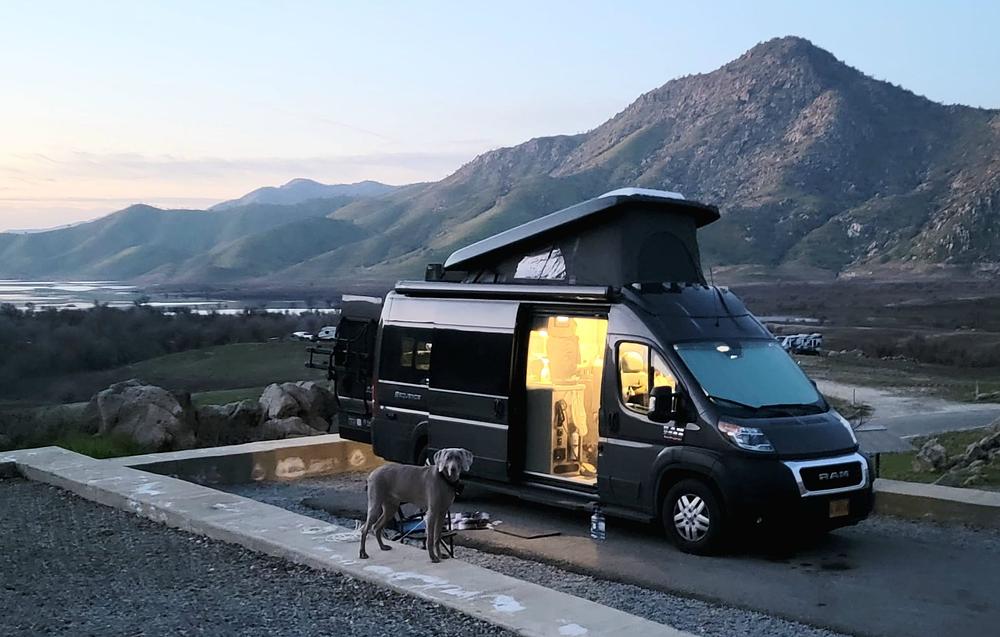 The best layout for a camper van with the bed in the back. Also has the pop top sky bunk with another bed in the top. Seats and sleeps 4. Propane cooktop, heat, and hot water. Has the optional onboard generator so you have power at the push of a button. Also has roof mounted solar for off grid. Includes Thule rear mounted bike rack.