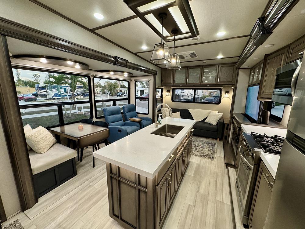 One of the most popular floor plans in a fifth wheel of this length, the 310GK is known for its rear kitchen layout, panoramic windows, and livable interior. This one has been significantly upgraded, including a premium Victron electrical system, Splendide washer/dryer, modernized furnishings, and thoughtful custom touches throughout. Equally at home parked at an RV resort or miles from the nearest hookup, it's been well equipped and is ready for its next owner. Currently located in Ft Myers, FL. Willing to do a live video tour if interested.