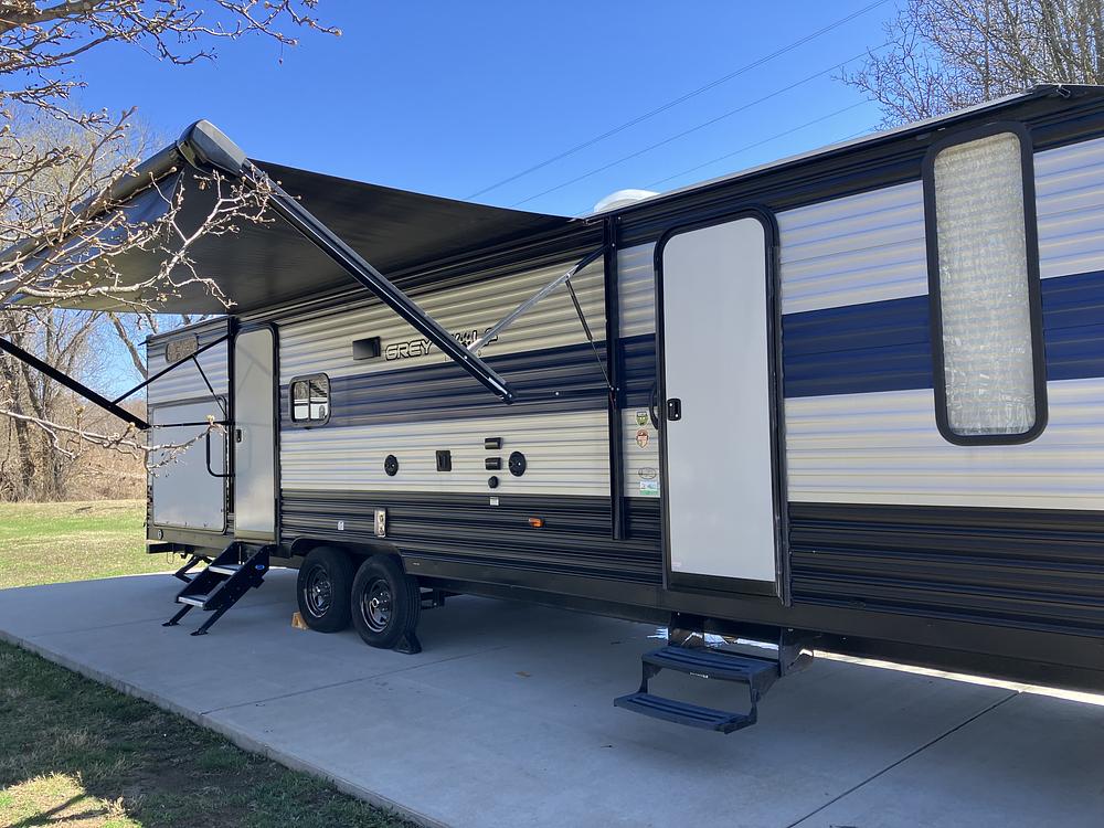 PRICED FOR QUICK SALE!! 36.6 Fully Loaded Family Trailer! Base Camp & Campfire packages combined. Sleeps 9 with dual rooftop ac. Complete OUTDOOR KITCHEN with sink, ice maker, 2 burner stove, griddle, fridge, lights & storage. KITCHEN: is black stainless-steel package with farm sink, 3 burner stove/oven, skylight, full size fridge, lots of storage, large dinette, couch, TV, Stereo, zebra black out blinds, solar battery charger, LED interior/exterior lighting, USB charging stations, remote control system thru apps. MASTER ROOM has OH & side hanging storage. 2nd Bedroom has 3 bunks with Teddy Bear bunks & lots of storage. BATHROOM has enclosed shower with vent, skylight and outdoor access. EXTERIOR: flip down travel rack, spare tire, 4 brand new tires, power awning, power tongue jack, hot/cold shower, black waste pump out, back up camera, 2 20# propane tanks, 50 amp. INCLUDES: RV STORAGE COVER & BLUE OX WEIGHT DIST HITCH Only selling so I can upgrade. Everything works great, no rips, no tears, no dents. NO WORRIES!! CLEAN TITLE IN HAND!!