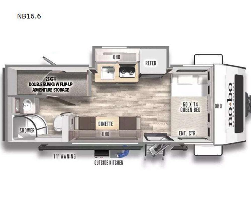 Inside, the No Boundaries 16.6 boasts a comfortable and functional living space with all the amenities you need for a comfortable camping experience. The kitchen is equipped with a sink, stove, and refrigerator, while the bathroom features a toilet and shower. The sleeping area can accommodate up to four people, with a cozy queen bed, convertible dinette and bunk beds in the rear.