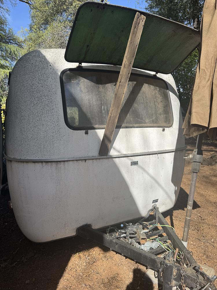 I had a dream to refurbish an old tiny Scamp trailer. All good until I pulled out the old stinky carpet and found water damage under the dining table and by the front door. (See current pictures) Too much repair for me! Needs new cushions, new cupboard doors, new floor, new stove, fridge. Currently has a flat tire but I have a new spare. These vintage Scamps are hard to find.