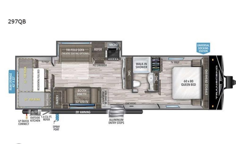 Outside, the Transcend Xplor 297QB is designed for outdoor living, with an electric awning, outdoor kitchen, and speakers for enjoying music al fresco. The sleek exterior design and durable construction make this travel trailer both stylish and reliable on the road.