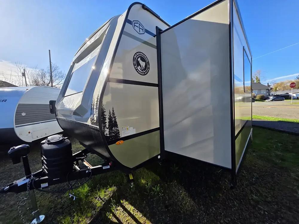 The 2026 Forest River No Boundaries NB20.5 Beast Mode is designed for adventurous travelers seeking a lightweight yet fully-equipped travel trailer. The interior showcases a well-appointed kitchen featuring a three-burner cooktop, stainless steel sink with high-rise faucet, microwave oven, and a generous refrigerator to keep provisions fresh during extended trips. The bathroom includes a spacious shower with skylight, porcelain foot-flush toilet, and vanity with medicine cabinet. The living area offers comfortable sleeping accommodations for three with convertible dinette seating and overhead cabinets throughout for ample storage. Large panoramic windows flood the interior with natural light while providing scenic views. The exterior is built on a durable aluminum frame with laminated sidewalls and a one-piece rubber roof for weather resistance. An electric awning with LED lighting extends your living space outdoors, while the exterior shower and black tank flush system add convenience. The Beast Mode package typically includes off-road capabilities with higher ground clearance, all-terrain tires, and enhanced suspension for rugged adventures. Modern amenities include USB charging ports, LED lighting throughout, a Bluetooth stereo system with interior and exterior speakers, and a flat-screen TV mount with cable hookup. Storage solutions feature exterior pass-through compartments, underneath bed storage, and overhead cabinets. Safety features encompass smoke and carbon monoxide detectors, fire extinguisher, emergency exit window, and electric brakes. The unit comes pre-wired for solar panels and includes a power tongue jack, stabilizer jacks, and exterior ladder for roof access, making it an ideal choice for both weekend getaways and extended camping adventures.