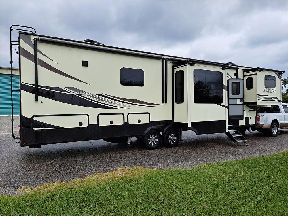 2018 Keystone Alpine model 3701FL 5th wheel RV. Great for a family to set up at the beach, or for a hunters getaway. Recent $8600 major service including new axles, springs, brakes, serviced both AC units, and all 5 slides. Tires 1 1/2 years old. RV has slide toppers on all slides. Roof and body resealed. New awnings. Has solar panel and onboard batteries. Onboard Westinghouse dual fuel (gas or LP) 30 AMP inverter/generator. Two 30 lb LP tanks for generator, and two for heat and kitchen stove. Large TV in living room and smaller one in the M BR. Regular queen mattress in M BR. Sat. antennas for Dish and Direct TV. Microwave stove. New Samsung full sized refrigerator. RV sleeps 6 people comfortably. Full size bath in M BR. Separate 1/2 bath. Will include Garmin GPS for RVs, tire minders, and backup camera. Two large pass through storage bins, large front and rear storage bins, as well as a large cargo hold.. Unit has been used and shows some wear but is in good condition. Clear title in hand.