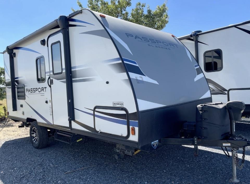 Passport 175BH specs include a length of approximately 21 feet, a dry weight around 3,250-3,400 lbs, a GVWR of 4,500 lbs, and a hitch weight of about 410 lbs. It sleeps around five people with its queen bed and bunks and typically includes a 43-gallon fresh water tank, 30-38 gallon grey and black tanks, and a 30,000 BTU furnace.