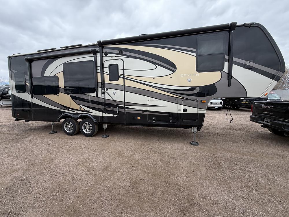 The 2020 Vanleigh Beacon 34RLB is a luxurious fifth wheel trailer that offers all the comforts of home while on the road. If you have not looked at a Van Leigh Beacon you are in for a pleasant surprise. All solid wood cabinets and beautiful leather couch and love seat. All top quality appointments. With a spacious interior layout and high-end finishes, this model is perfect for extended vacations or full-time living. The Beacon 34RLB features a well-appointed kitchen with modern appliances, a comfortable living area with ample seating, and a cozy bedroom with plenty of storage space. The exterior of the trailer is equally impressive, with a sleek design and durable construction. Whether you're exploring the great outdoors or parked at a campground, the Vanleigh Beacon 34RLB provides a comfortable and stylish home base. With a reputation for quality and reliability, Vanleigh is a trusted name in the RV industry. Upgrade your travel experience with the luxurious Vanleigh Beacon 34RLB fifth wheel trailer. 18 Point inspection recently completed at certified RV repair center with all known issues addressed. 3000 watt inverter with four 400 watt solar panels recently installed. New awnings just placed with new outside light. Roof top just resealed. No known issues not addressed. Comprehensive Vehicle Service Contract and Tire and Wheel Service Contract in effect until 11/6/2029 included with purchase.