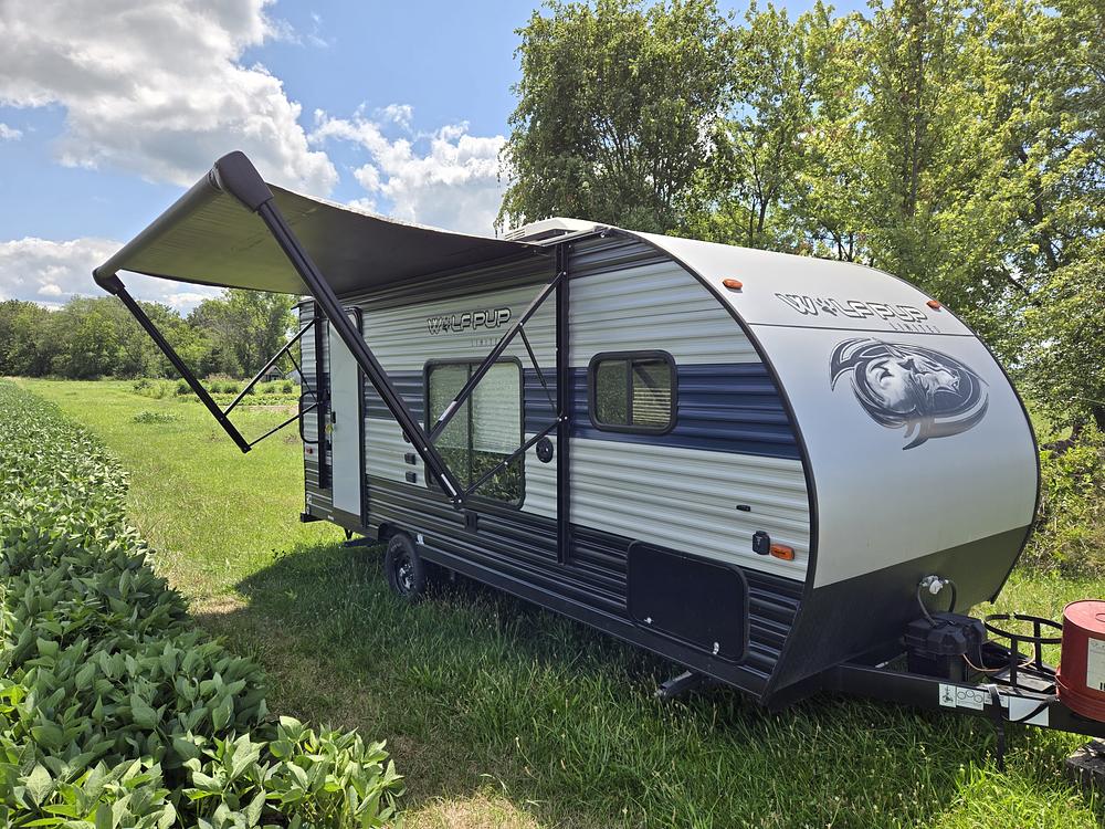 Used 2021 Forest River Cherokee Wolf Pup 16HED. Second Owner used very little. Front bedroom, couch and table convertible beds along sides. Rear kitchen with refrigerator and freezer 12V/120V, microwave, two burner LP cooktop and single sink. Electric/LP hot water heater. TV and radio system with outside speakers. Electric awning and single solar panel. AC/Heater system. Rear bathroom with separate shower. Outside shower. Penty of storage under front bed accessible from inside and out. Additional storage in cabinets around the camper and under table seats. Lite weight and easy to pull. 2-inch ball hitch. Includes one LP tank and one battery. Needs spare tire replaced. Currently in storage. Maybe seen after March 18, 2026. Purchased from car dealer in Casey, IL