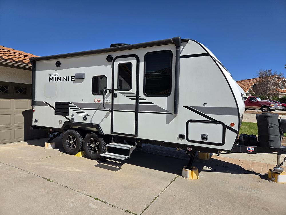 The trailer comes with an Andersen hitch and sway control device ($700 purchased new), sewer and water hoses, trailer cover, and wheel chocs. There is an electronically controlled awning, upgraded screen door, electronically powered jacks and slide-out, heating and air, and high clearance "Adventure package". This unit is 7 feet wide, so sight lines are great when towing, and storage is easy in narrow spaces. Tires have under 5,000 miles on them, and spare is mounted on back bumper. There is also a hitch receiver for mounting bike racks or other toys. Power is generated by solar panels on the roof, and 2 batteries. Dual propane tanks power the water heater and stove. Lots of outside storage, plus an outdoor shower set-up, shoreside power cord, and cable connection.