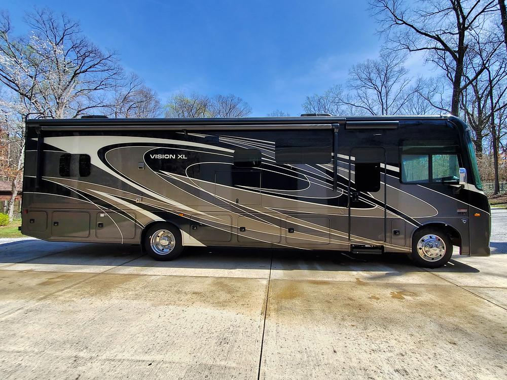 PRIVATE SELLER. 2022 Entegra Vision XL 34G Class A motorhome. This low mileage (12,051) gas coach is in excellent condition and super clean, always stored under covered parking. Original owners, non-smoking. Upgraded Lithium Ion 400AH house battery system is only 1 year old. Upgraded audio visual wiring system can sync all 3 interior and exterior televisions to your preferred satellite or cable signal. Outdoor entertainment center. Customized, adjustable, removable shelving added to all closets and pantries. The walk around king bed master, motorized overhead drop bunk, sleep sofa and convertible dining unit provide plenty of sleeping space for 6-8. Comfortable power reclining theater seats, motorized tv lift, Furion electric fireplace and day/night roller shades in living area. Residential size refrigerator and microwave, solid surface countertops, recessed stainless steel sinks, and water filtration system. Washer/dryer hookups in kitchen pantry closet.