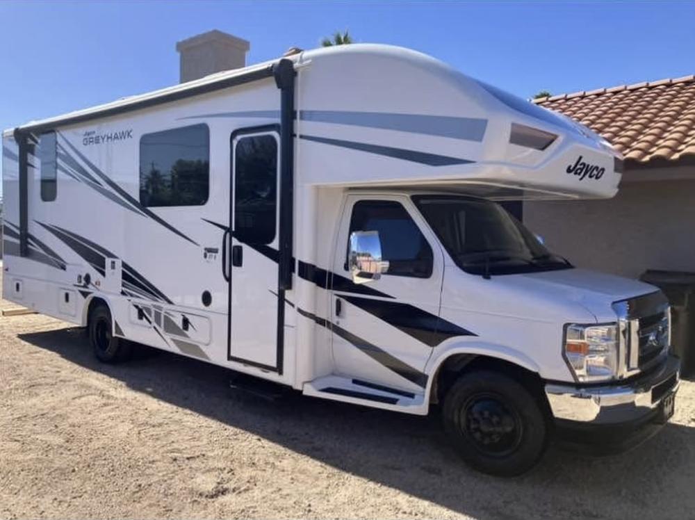 Jayco Grey Hawk Class C motor home. Excellent condition! Im original owner. 7000 miles, purchased new end of September 2024. Full coach warranty through Jayco till end of September. 2026 Ford chassis Sep 2027 and longer drive train. Solar panel with lithium coach batteries. Theater seats Coach all Bluetooth from cell. Cummings generator just Svc 30 hours Auto level 2 slides 2 acs 2 tvs all bugs worked out!Just had waxed and buffed and oil changed, black out shades and factory front window covers foam mattress cover. Gas and electric water heater. Xm radio with outside speakers brake box for trailer pwr windows door locks and mirrors 55 gal fuel E450 7.3 ltr V8 7500 lb tow capacity 750 tongue weight fresh water 42 grey 41 black 31 gallons Rv lock keyless door entry with remote 30 ft long clear and clean title No sales tax $105,000.00