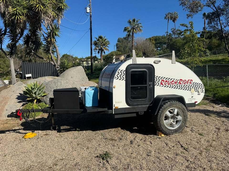 Working off a base model Little Guy Rough Rider 5 Wide (Local San Diego Compnay) this trailer has been completely retrofitted with an custom $25,000 AT Overland Air Ride Suspension. Under-body Storage and water tank have been added, with shore power, shower point, pump, drain, the works.