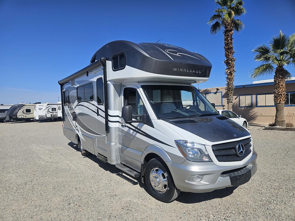 High-quality Class C diesel motor home built on a Mercedes-Benz Sprinter 3500 chassis with a 3.0L turbo diesel engine. It is highly regarded for its fuel efficiency, averaging 16-18 MPG. The 24G floorplan features a rear slide-out queen bed and a total of two slides to maximize living space.