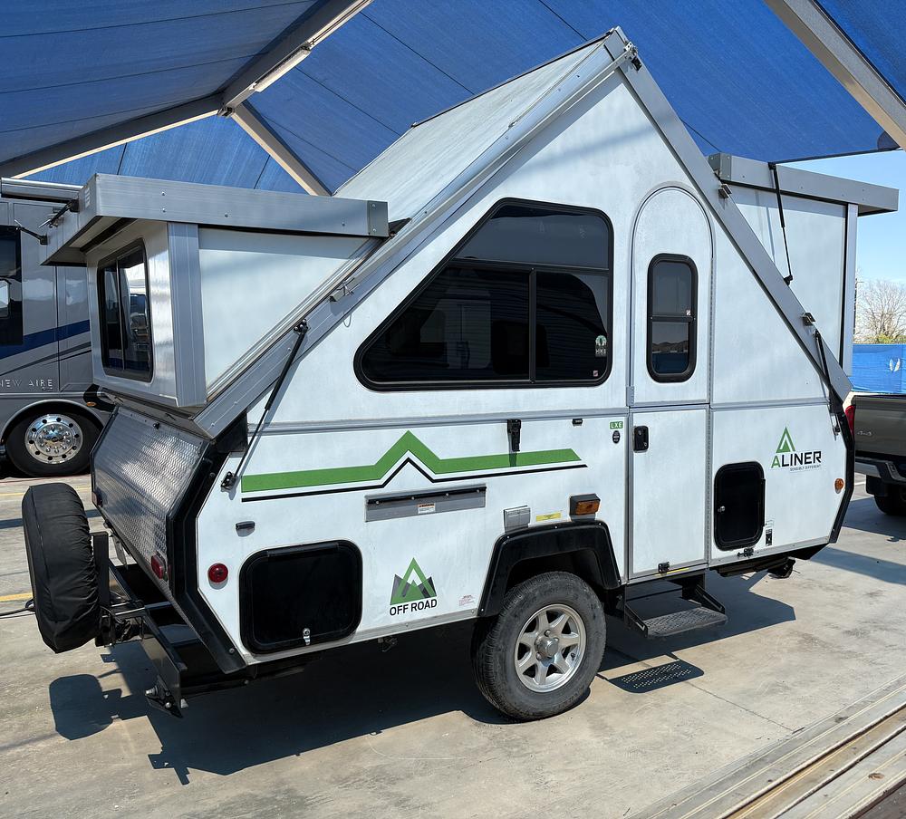 This 2018 ALINER LXE is a 15' towable "A-frame" pop up camper with 15" tires and off road kit that offers comfortable and convenient camping accommodations. This model has essential amenities such as AC, kitchen, microwave, 3.2 cu. ft. AC/LP/12v refrigerator/freezer, LP 2-burner stove, water heater, shower/cassette toilet, and a 100 watt solar panel. Also includes 4 stabilizer jacks, dual LP tanks, outside shower, and an outside LP connection. For protection against faulty RV park power there is an EMS surge protector installed. A 300 watt DC to AC power inverter is installed. Trailer is equipped with electric brakes.