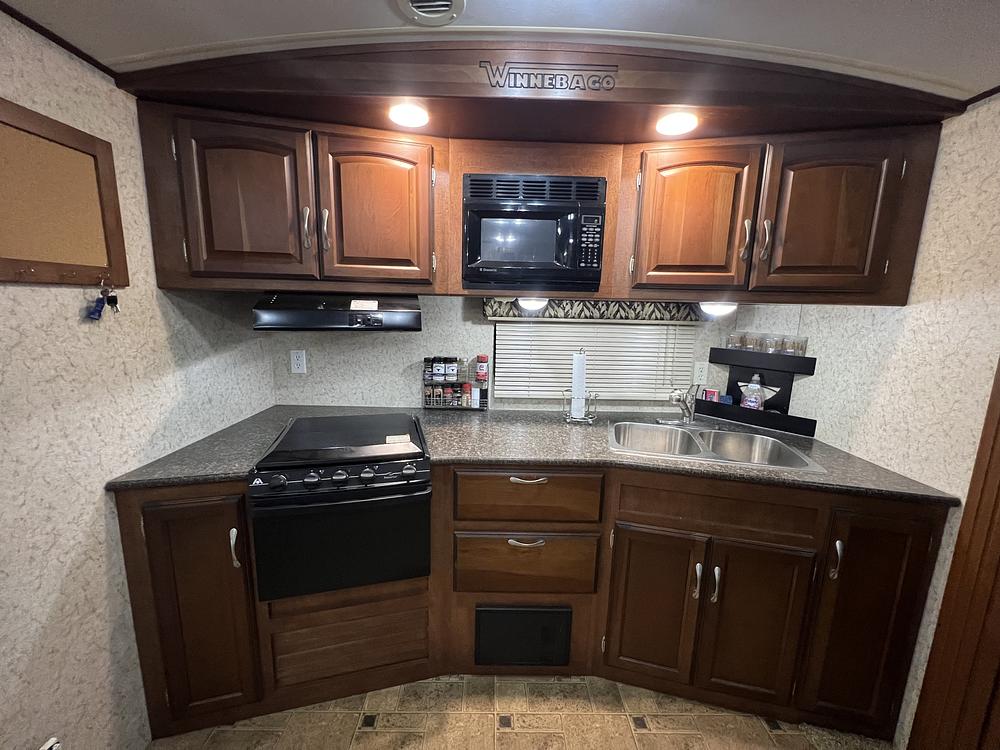 Beautiful, well-maintained Winnebago 26RK travel trailer with a spacious rear kitchen layout. This is a full-size unit (not a mini) with tons of storage and solid wood cabinetry throughout.